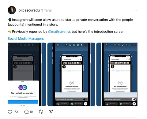 Creator können nun Chats mit Personen beginnen, die sie in ihrer eigenen Story erwähnt haben, und zwar direkt über die Erwähnung in der Instagram Story. Das ist auch mit mehreren Personen möglich, wenn diese alle in der Story erwähnt wurden. Zu Beginn des privaten Chats wird dann die betreffende Story geteilt. Social Media Experte Radu Oncescu teilte die Neuerung auf Threads: